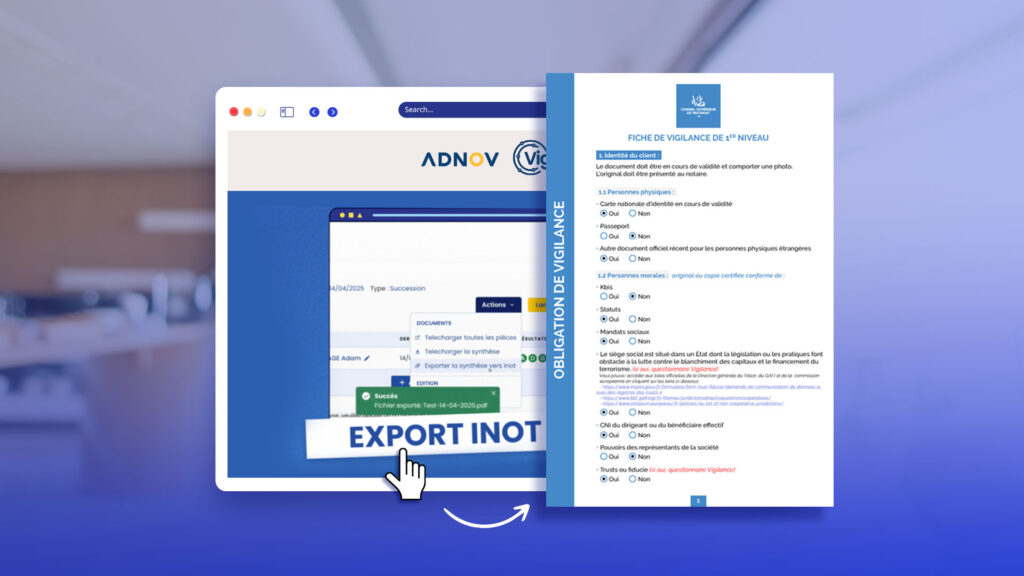 Fiche vigilance automatiquement complétée à chaque étape du dossier. Export PDF ​en un clic de la fiche vigilance ​dans iNot ou Signature​, pour un partage facilité de la fiche ​entre confrères.